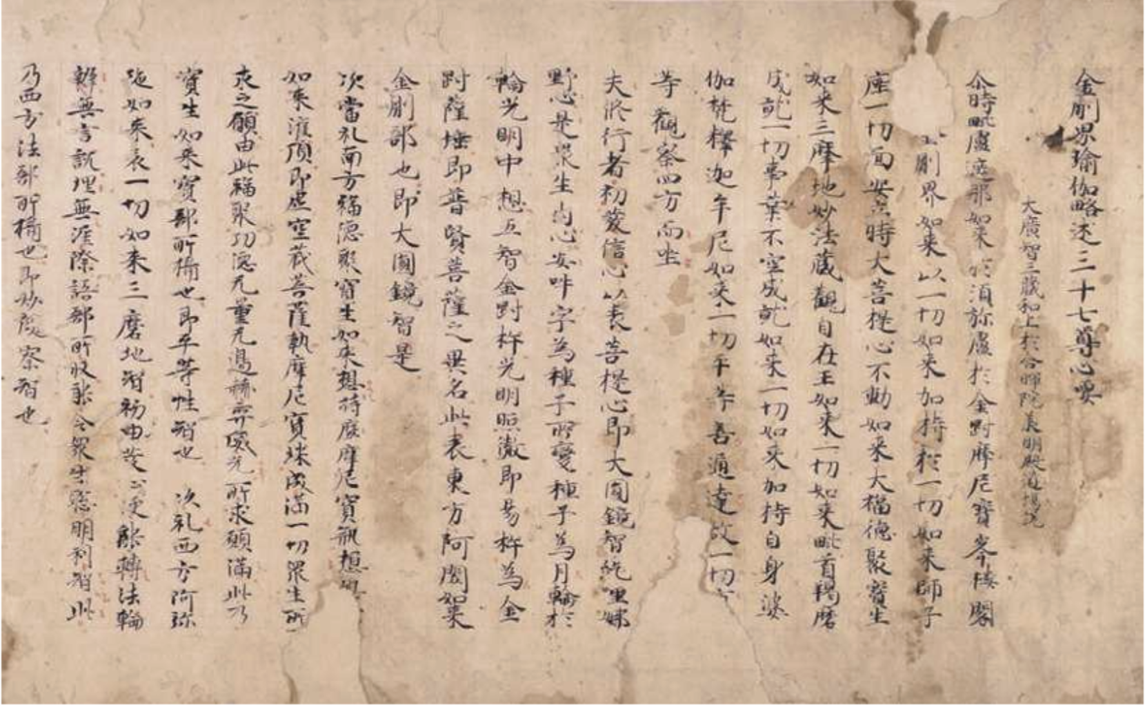 空海の時代から時を経るが、多彩な密教美術品が伝わる。金刀比羅宮の「金剛界瑜伽略述三十七尊心要」[図9]は平安時代中期の温和な筆致による密教経典の優品で、長暦4年(1040)の奥書をもつ。極楽寺の両界曼荼羅図[図10]は、平成15・16年度の修理後、初の里帰りとなる。萩原寺の法華曼荼羅図とならぶ県内最古の密教絵画だ。行徳院の六字明王立像[図11]は、平安時代に遡る六字明王の彫像として国内唯一のもの。近年の修理により、その価値が再確認され香川県指定有形文化財となった。與田寺の不動明王立像および童子坐像[表紙]も、重要文化財指定後の修理を経て、今回初公開となる。修理において、像内墨書に運慶の父「僧康慶」の名が確認された。江戸時代、弘法大師九百年遠忌を控えて、東寺から與田寺に移入された尊像である。ほか法然寺の天弓愛染明王坐像[図12]は高松藩主松平頼重の発願による大仏師久七の作で、注目される江戸時代の密教尊像だ。