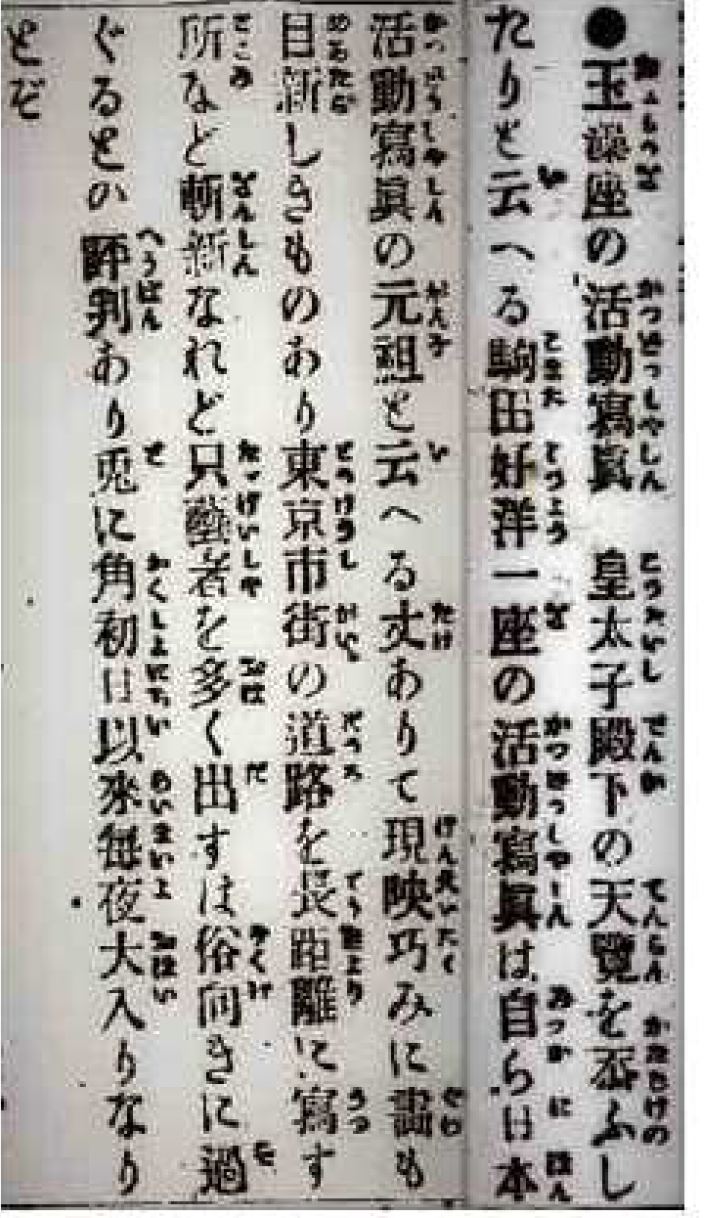香川県では、明治31年の秋に、駒田好洋という活動弁士が高松で巡回興行をしたと本人が述懐しています。彼は明治35年5月にも高松市片原町にあった芝居小屋「玉藻座」で興行しています。当時の新聞、「香川新報」にも記事が掲載されており、盛況ぶりが分かります(図1)。