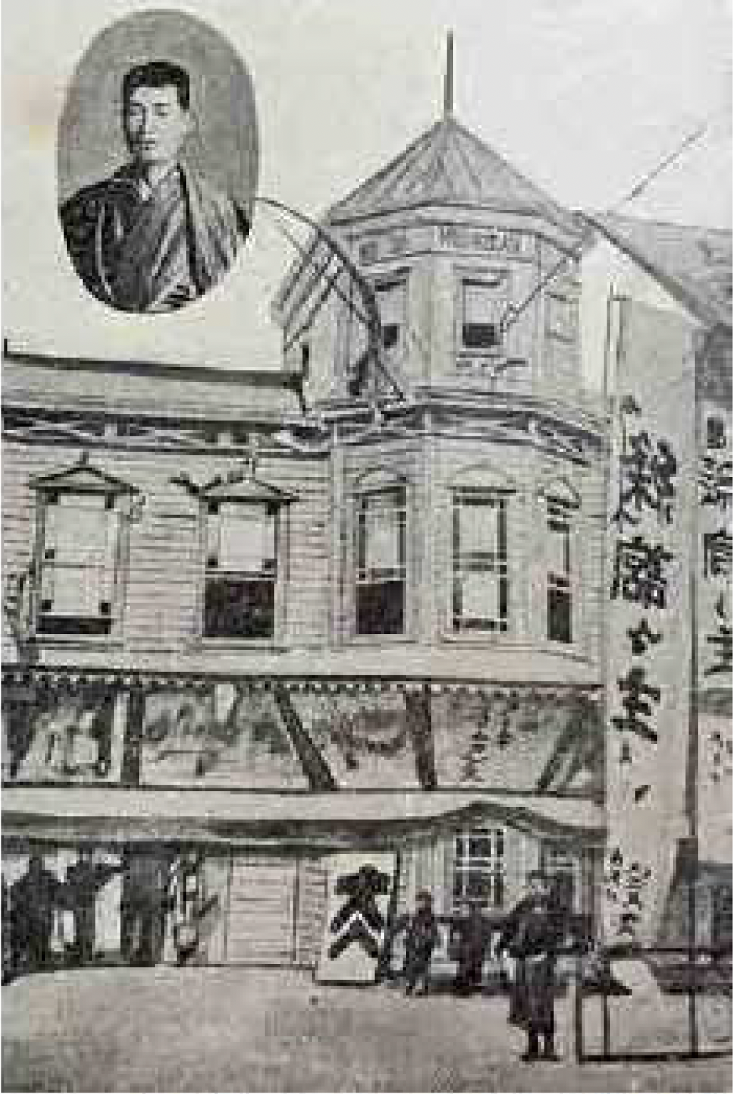 常設映画館として初めて新築されたのは「緑館」です。大正元年(1912)10月25日、高松市東瓦町に開館しました。残念ながら写真は確認できませんが、当時の緑館の挿絵が残されています(図2)。「香川新報」によると、ハイカラで2階は柱が1本もなく畳席と長椅子席があったようです。実はこの年、4月30日に高松電気軌道が開通し、出晴駅(現 ことでん瓦町駅付近)が開業しています。新しい駅の近くに3階建の華やかな映画館。明治末期の高松市中心部の発展と映画館建設には深いつながりがあったのです。