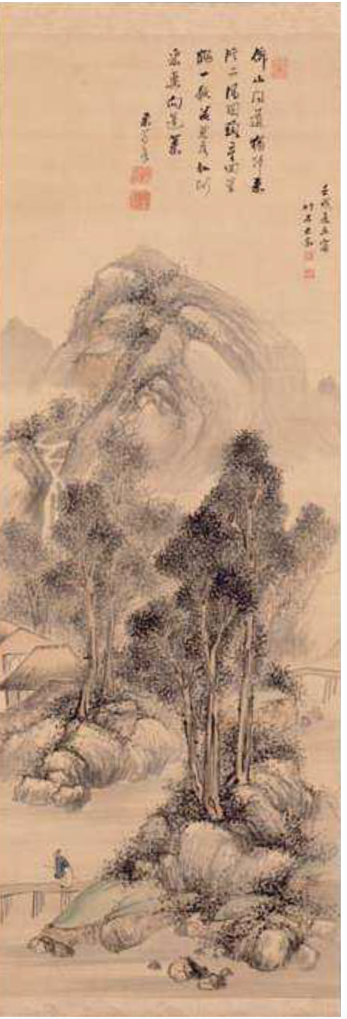 縦長の画面にすっと伸びる木々、その奥には霞がかった山々が描かれます。縦長の構図や手前に橋を渡る人を配置することによって、木々の大きさや山の高さが際立ちます。