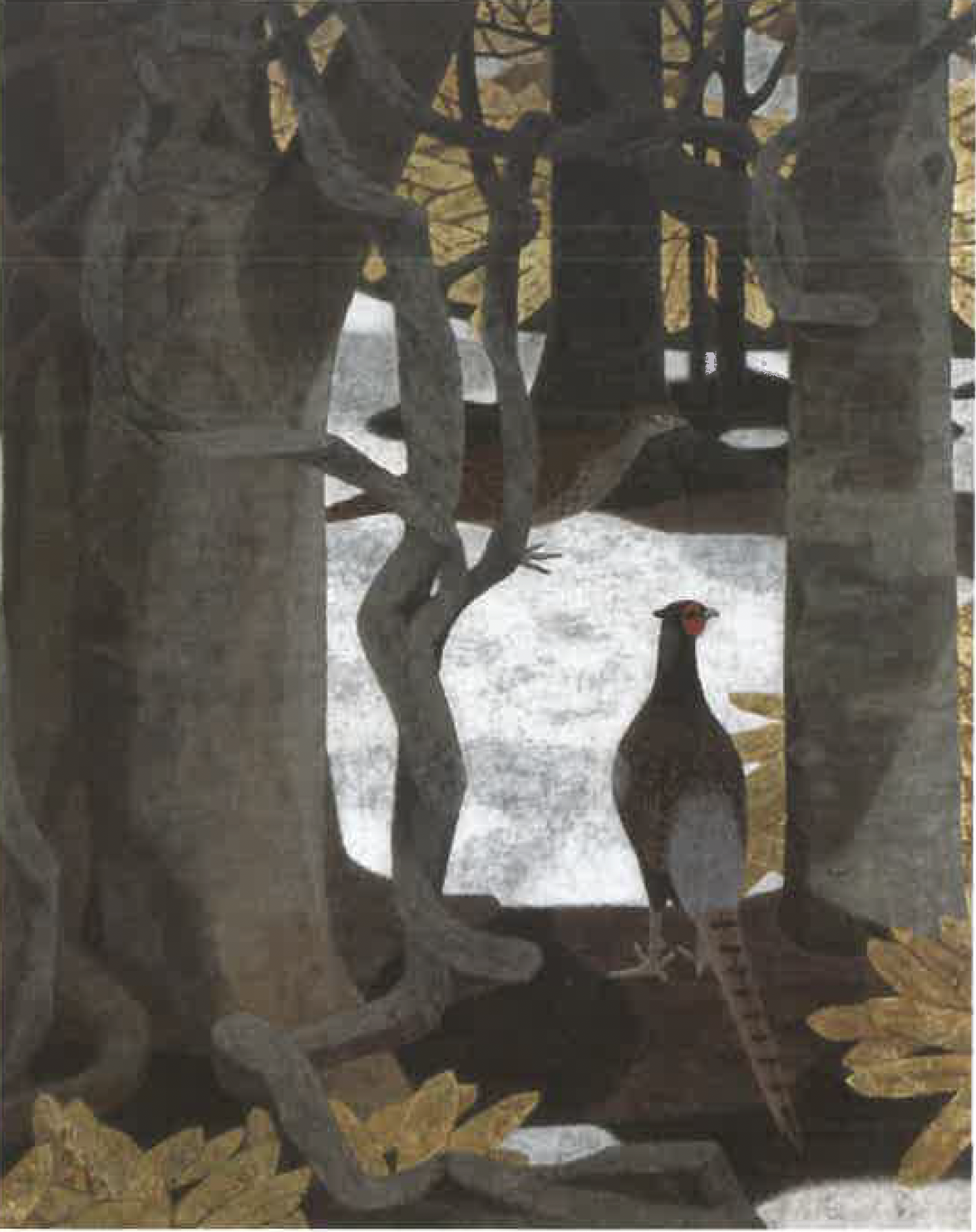 樋笠数慶《春雪》では地面にうっすらと積もった雪を描きます。木々の間には、雌雄の雄が登場します。春の季語でもある雄は、春から初夏に繁殖期を迎え、つがいで行動するようになります。絵画中の“雪”と“つがいの雄”からは、季節が冬から春へと変化していく様子が読み取れ、作品タイトルの春雪(春になって降る雪)とつながります。