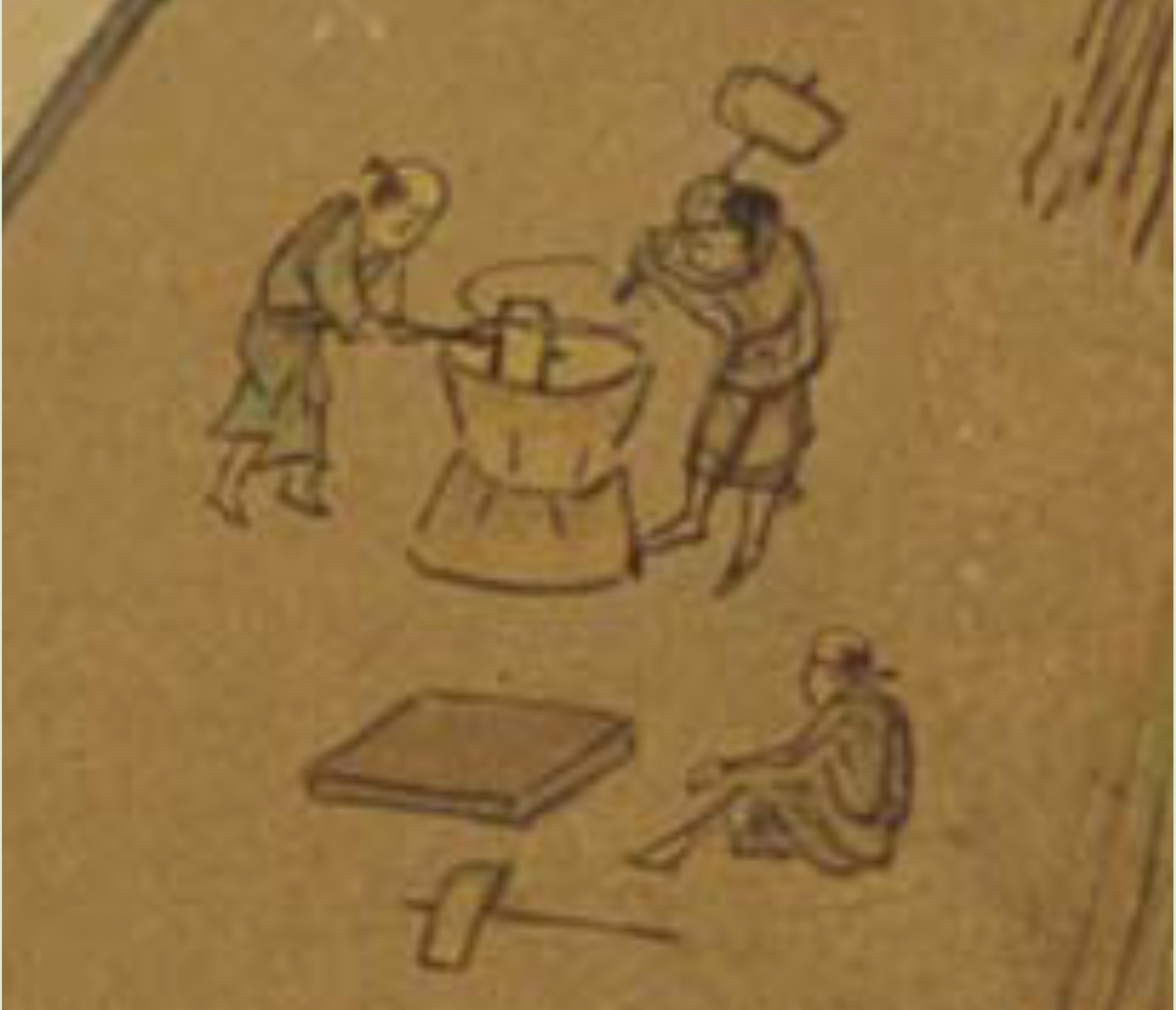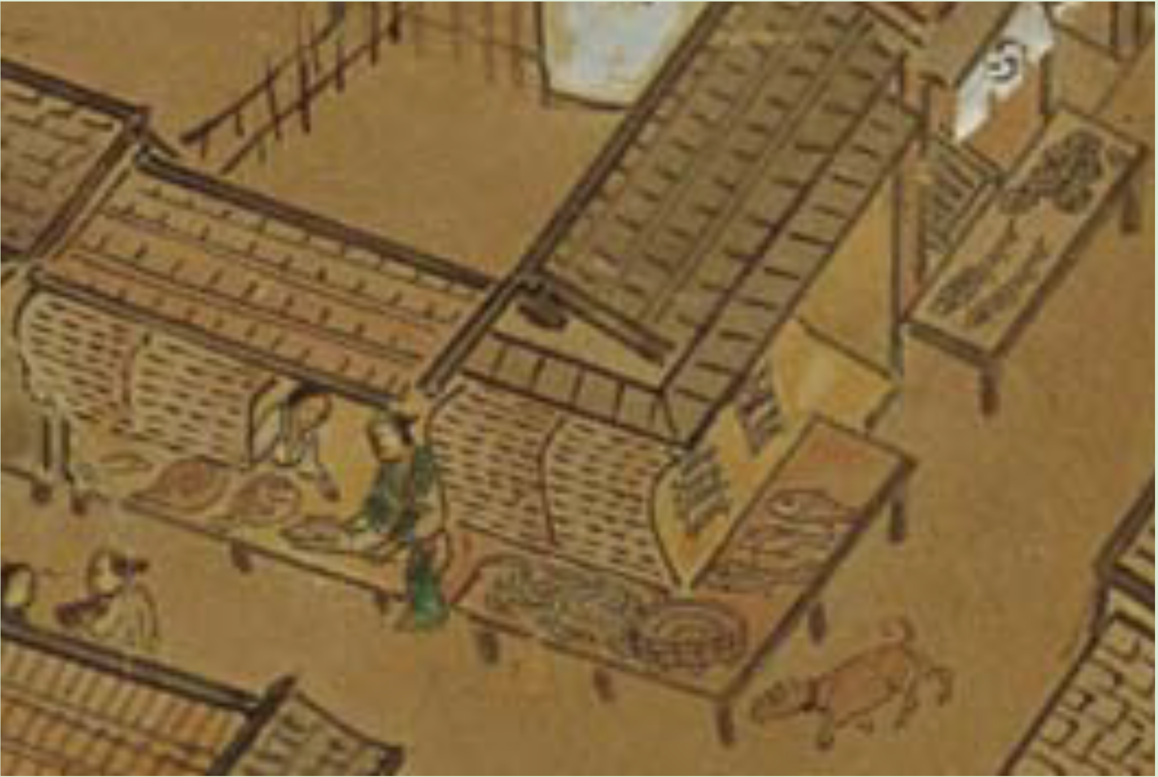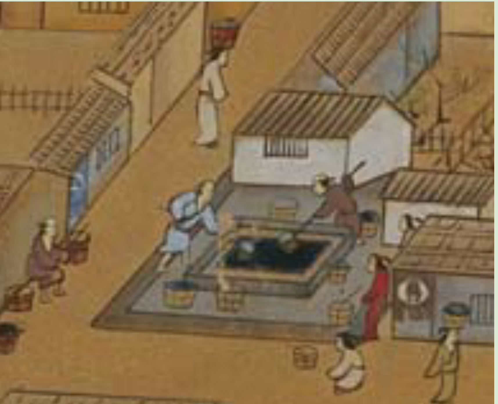 高い視点から、地図の上に景観を絵画的に立ち上げる手法で描かれた都市図屏風の代表作とされていますが、細部に目を凝らしてみると、登城する武士の姿、商店ごとに異なる暖簾や店先の商品、井戸での水くみや、製塩作業、餅つきをする人々、荷物を運ぶ馬や首輪を付けた犬など数えきれないほどの人物や動物が随所に描かれており、当時の人々の暮らしぶりをうかがい知ることができます。