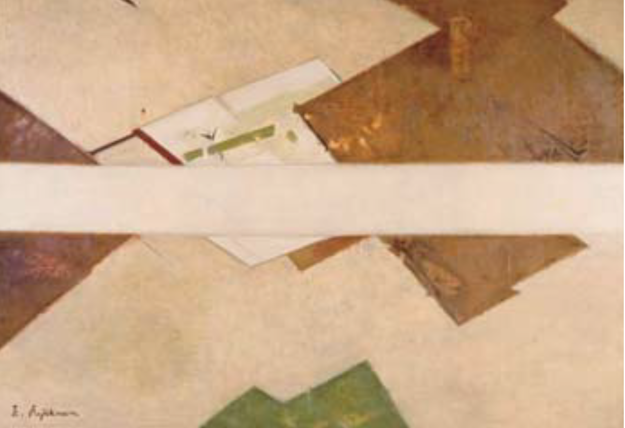 第3のテーマと呼べるものは、50年代末から60年代にかけて目立つようになる、形や色面の構成に高い関心を寄せていることがうかがえる作品シリーズです。なかでも菱形が浮かび上がるように描かれている《菱形の構成》(1967)(図3)には、余白、あるいは色や形の相乗効果を狙っていることが伝わってきます。この時代に培われた形や色の取り組みの成果は、後述するような、晩年の裸婦や静物、風景を取り入れた心象的な作品シリーズからうかがい知ることができます。