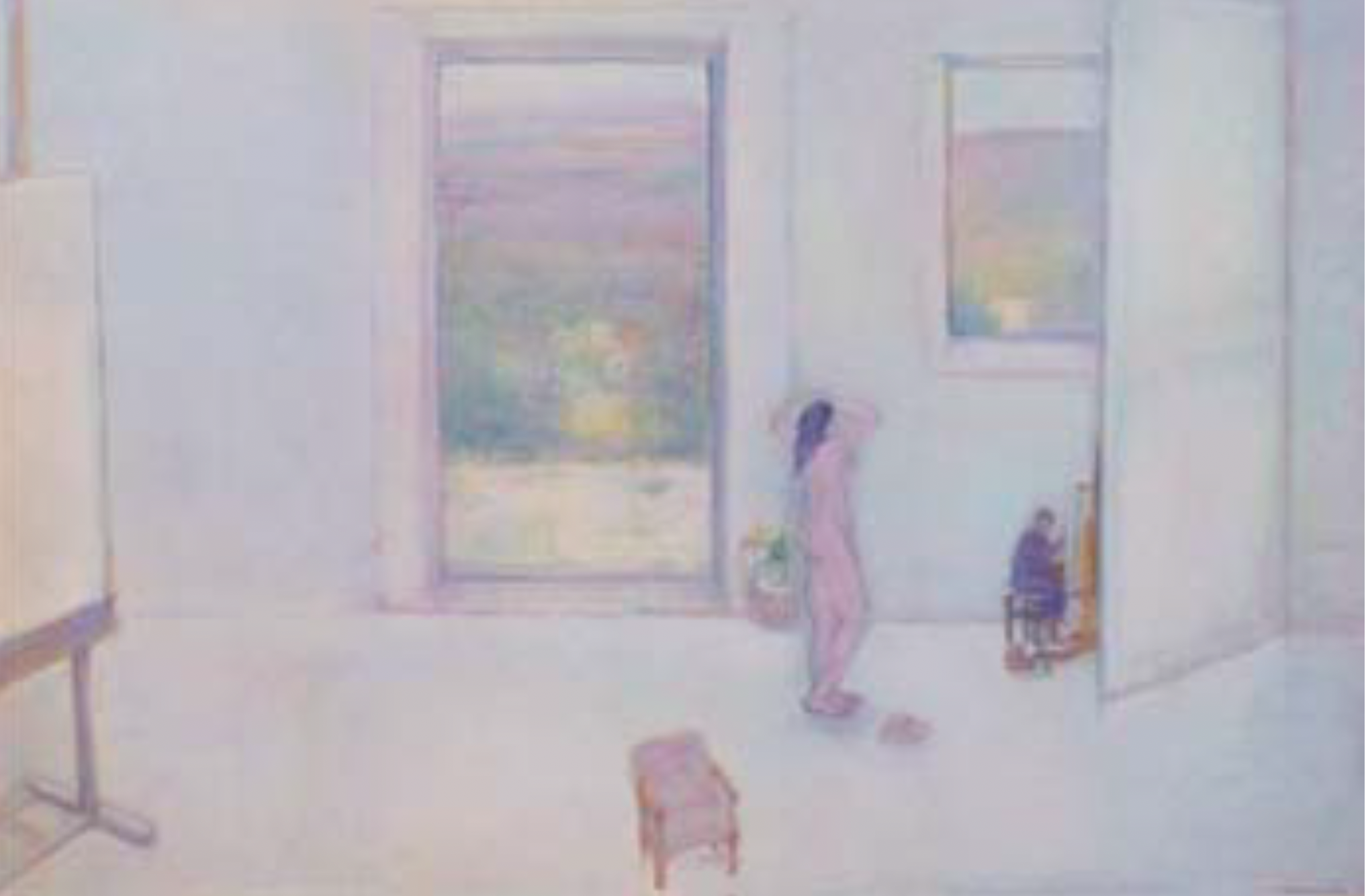 ここまで栄子の人物・静物・画面構成という3つのテーマをみてきました。晩年、その融合が図られるようになり、画面全体の色調が淡く輪郭線が細く柔和に描かれるようななかで、栄子自身の物語が紡ぎ出されるかのように、人物と静物が登場するようになります。たとえば、《彫刻のある室内》(1981)で彫刻が登場するように、どのような意味を抱き続けた彫刻だったのでしょうか。《ひろがり》(1976)では、《ムーアの彫刻のある風景》(1975)で用いたムーアの彫刻とともに、それを眺めるかのように人物が配置されています。さらには、《画室と私》(1978)(図4)では、生涯のテーマともいえる裸婦に向かい合う自身の心象が描かれました。これまで自分を作中に登場させることがほとんどなかった栄子が、室内にいる自身とモデルを描いています。こうした晩年の作品群からは、先にみた《菱形の構成》に見受けられる画面構成への追求と、栄子のテーマとなっていた人物画と静物画が融合したものであることが伝わります。