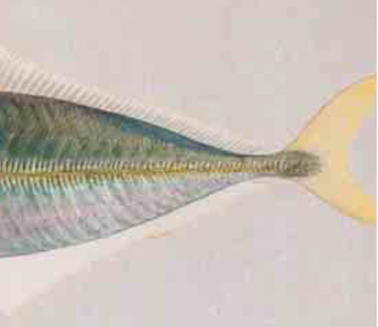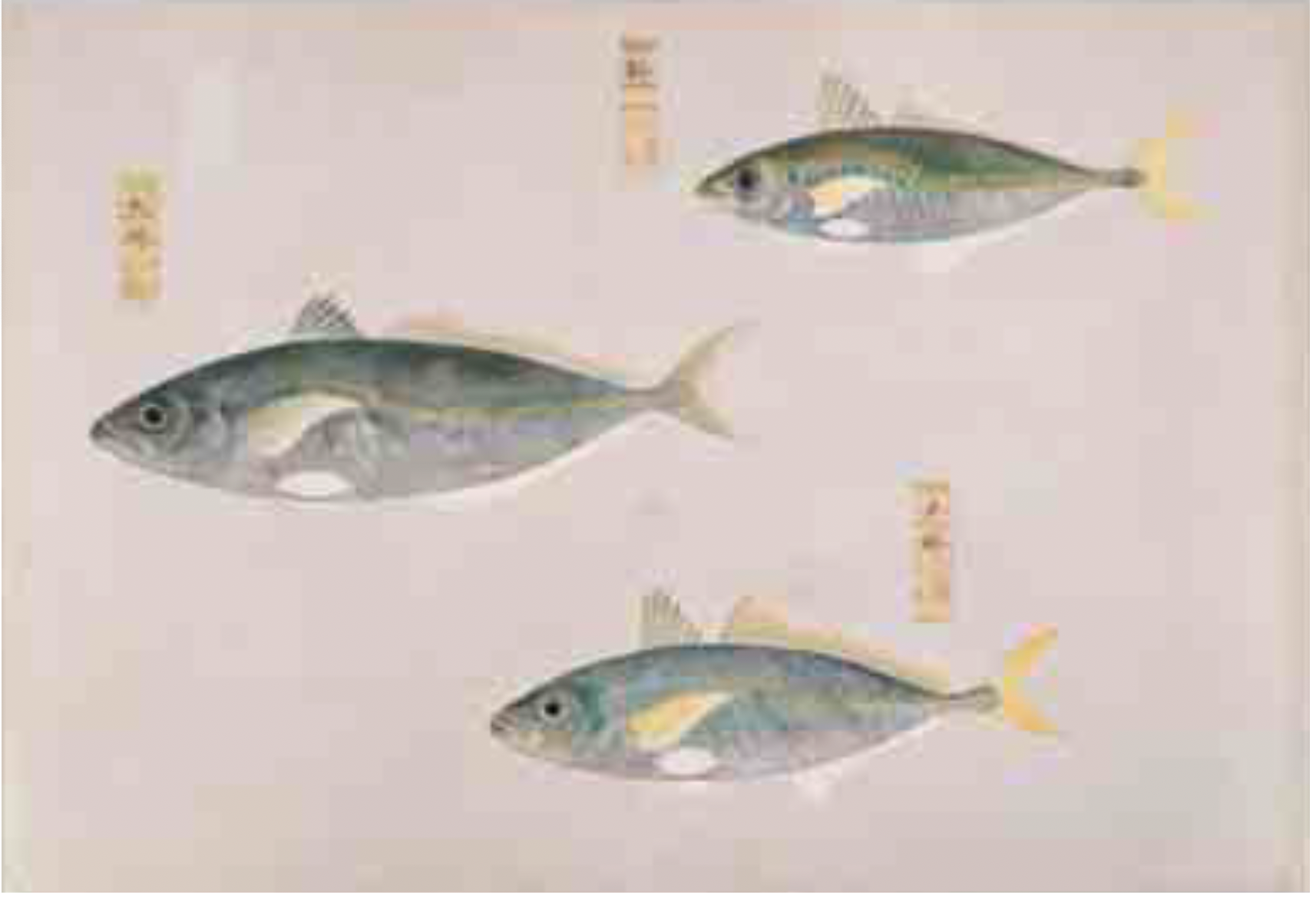 松平家図譜では様々な技法を用いて質感や立体感を出そうとしており、そのひとつが、箔の使用です。魚類では箔の上に彩色を施し、“鱗”「衆鱗図 第一帖」(図2)にみられるような、その生々しい光沢のある質感となっています。