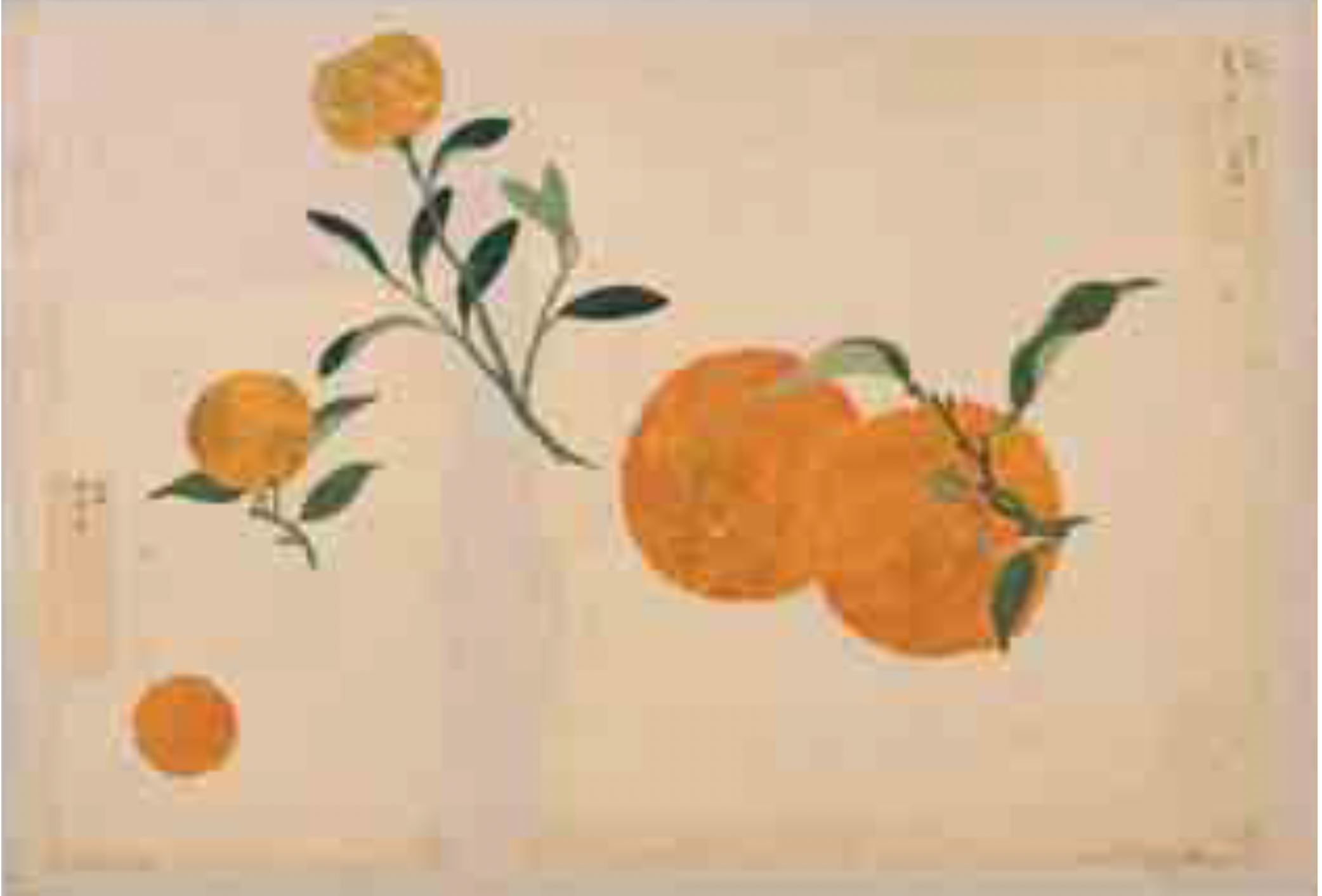 “夏ミカン”「衆芳画譜 花果第五」(図3)に注目すると、果実の皮の表面が凸凹していることに気が付きます。これは、貝がらをすりつぶして作った胡粉という白い顔料を塗り重ねて盛り上げ、その上に彩色を施したものと考えられます。“夏ミカン”では表面全体に、柑橘類の点状にへこんだ質感を表しています。この盛り上げは、柑橘類のほか果実の種、筋の体表を表すのに用いられています。