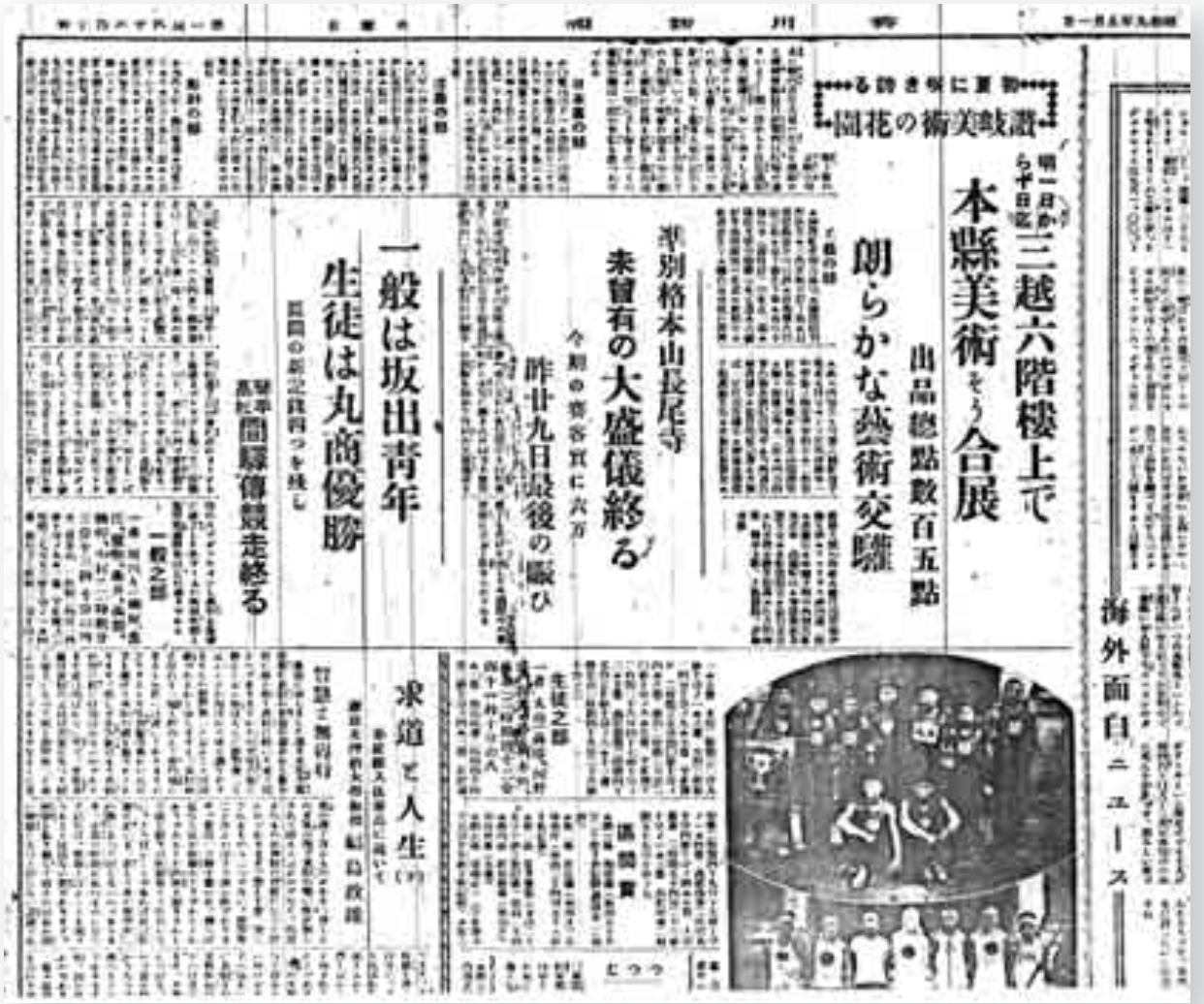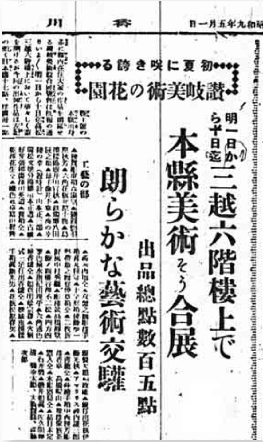 学芸課のロッカーで資料を探しているときに偶然、新聞記事のコピーを見つけました。「香川新報」、現在の四国新聞です。日付は昭和9年(1934)5月1日。昭和60年(1985)に発行された香川県美術展覧会(以下、県展)の歴史を綴った『県展史』の編集作業に際し、広く県民から資料提供を呼びかけ、入手したものということでした。それにしてもコピーとはいえ、よく残っていたものです。紙面には「初夏に咲き誇る讃岐美術の花園」「明一日(原文ママ)から十日迄、三越六階楼上で本縣美術そう合展」とありました。つまり、今年で83回になる県展のスタート、第1回県展創設の記念すべき日です。