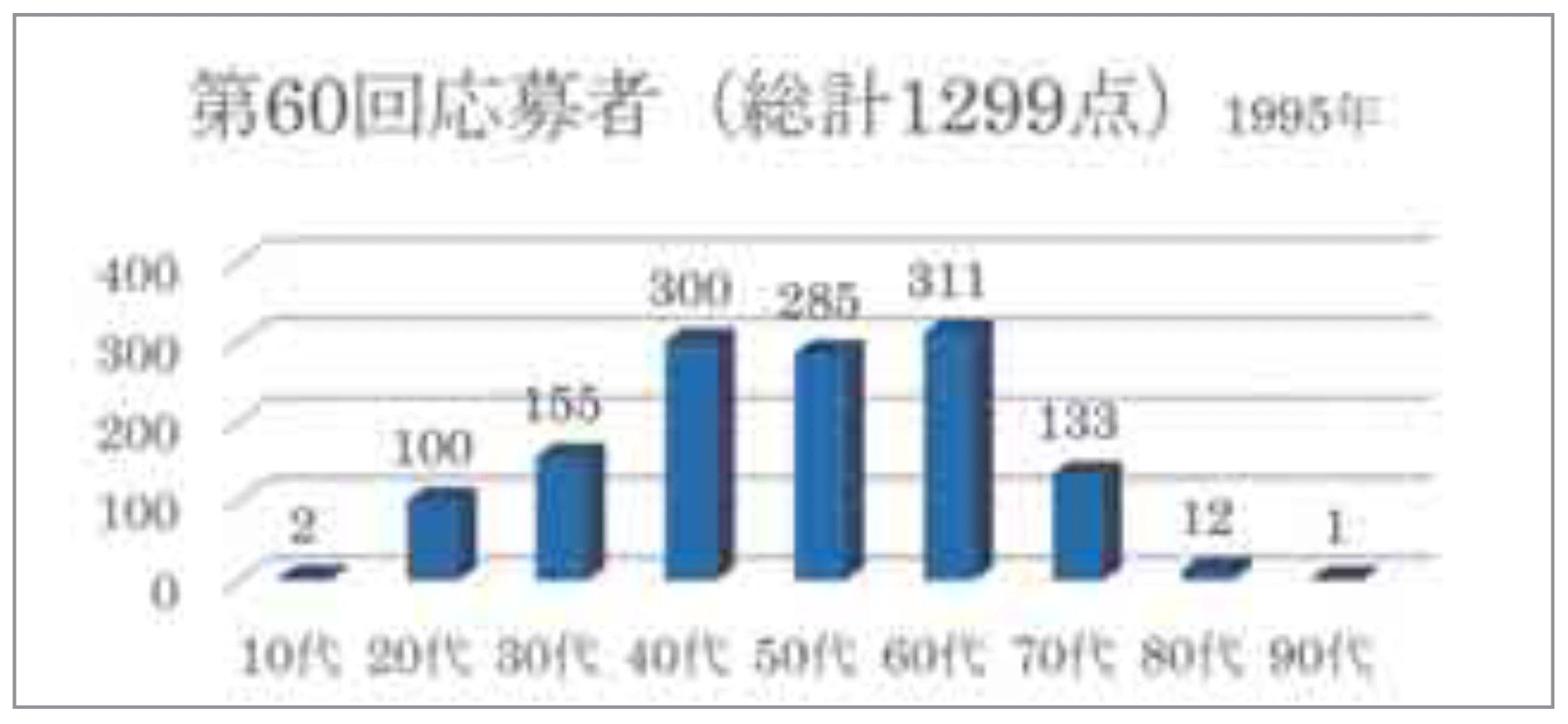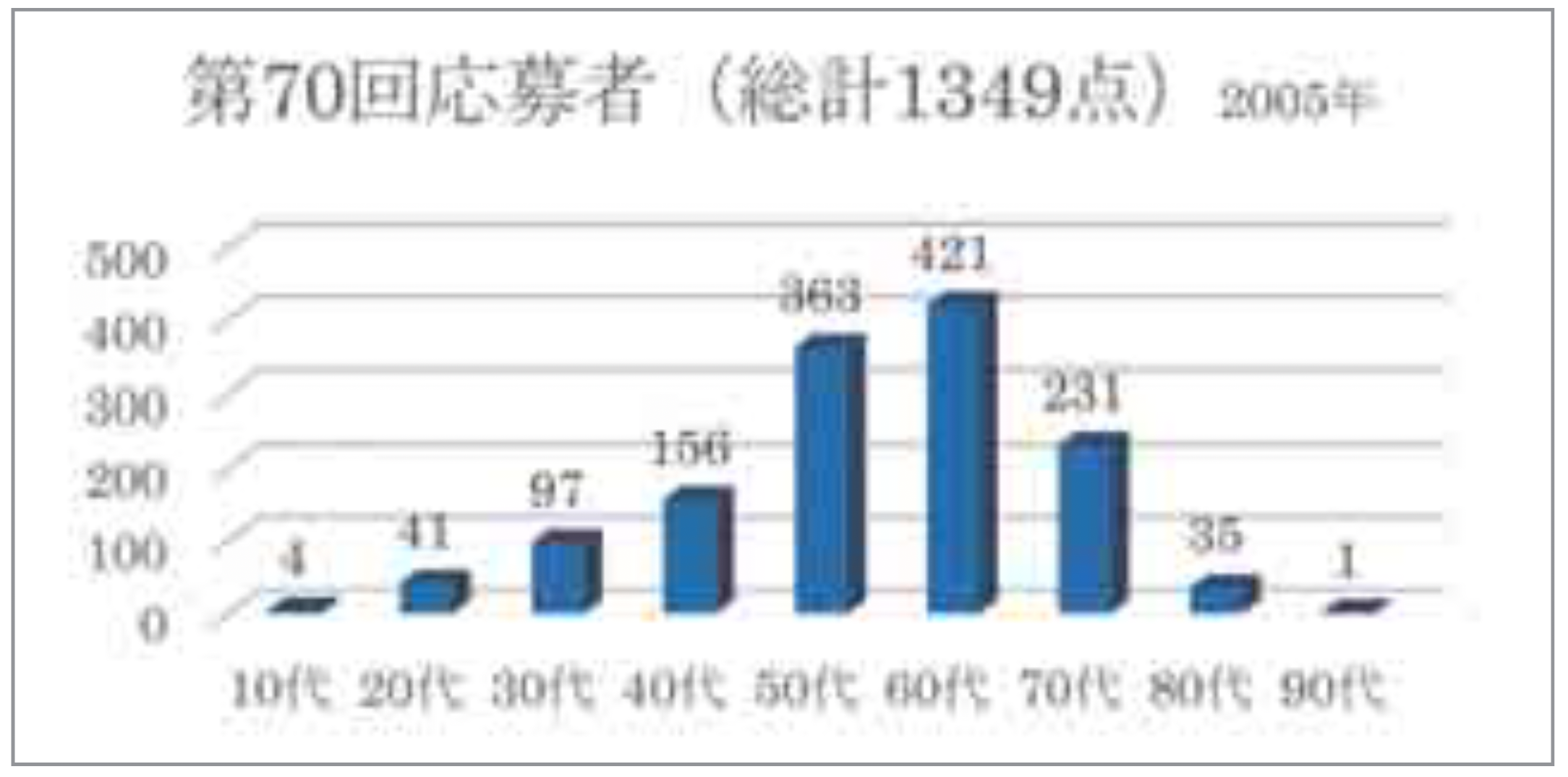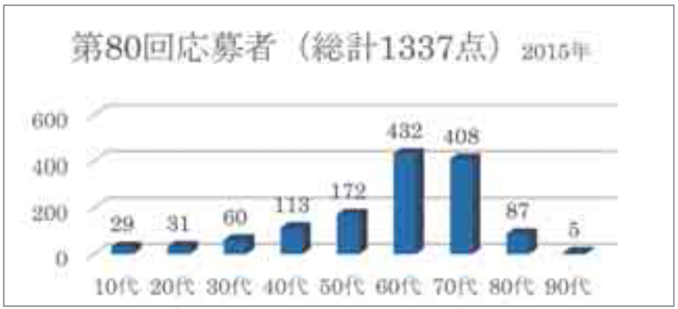 図のグラフは第60回(1995年・平成7)、第70回(2005年・平成17)、第80回(2015年・平成27)と3回の応募者の年齢別棒グラフ(10歳毎)です。ご覧になっていかがでしょうか。一番の問題は、若年層の応募者が加速度的に減少していることです。このまま推移すると、第90回、第100回はどうなるのでしょう。現在のような県展は消滅し、審査もなくなり、コンクールからフェスティバルになりかねません。