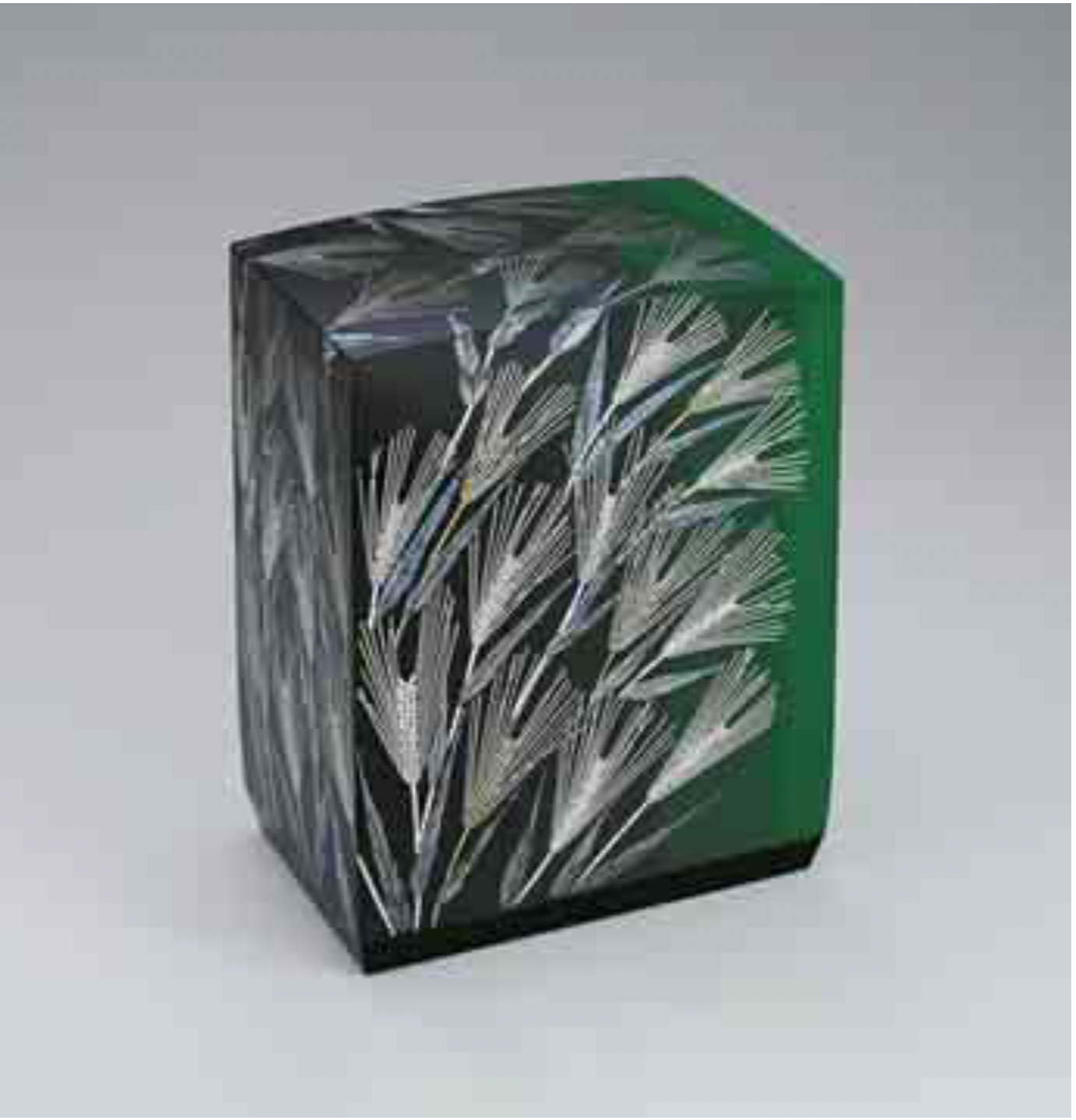 朝日新聞社賞を受賞したのは、漆芸部門の金城一国斎。作品名は切虫食錫箱「青麦」。明るい緑色の色漆を背景に、細い短冊状の白蝶貝を用いて、青々と成長する麦穂を表現しています。金城は広島県出身、香川県漆芸研究所を修了し、本格的に漆芸の道に進んだ方で、七代目の「金城一国斎」です。