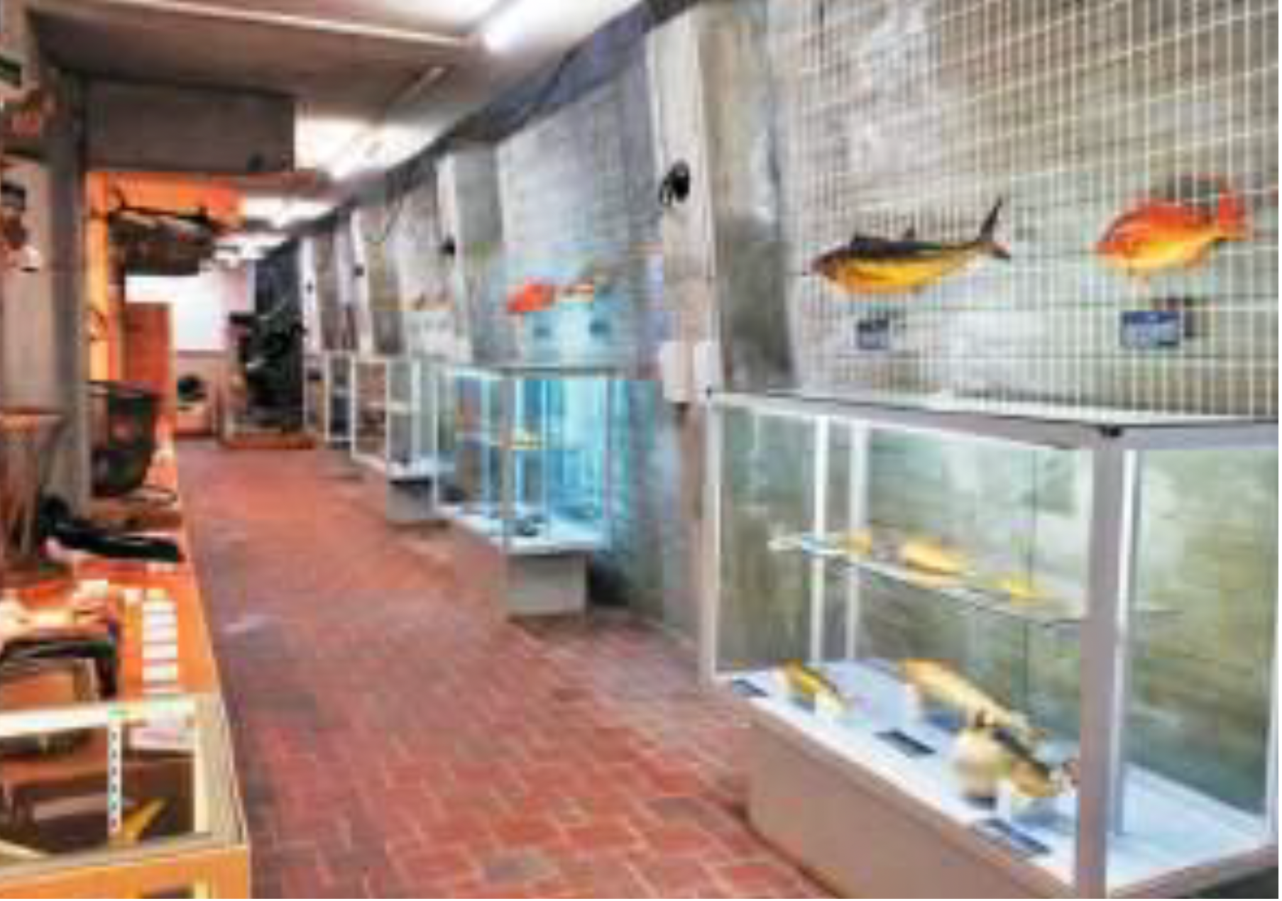 瀬戸内海歴史民俗資料館の第1展示室(1階)では、現在では見ることができなくなった瀬戸内海の漁法や、多くの漁撈用具を紹介しています。この展示室に今春から、魚のはく製を展示しました。これにより、どのような魚をつかまえるための漁撈用具か、より具体的に理解できるようになったかと思います。